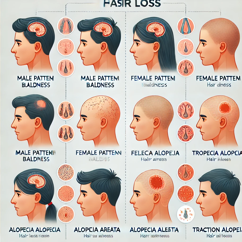 Hair loss, medically known as alopecia, encompasses various types and causes. The most common form is androgenetic alopecia, or pattern baldness, which affects both men and women. Other types include alopecia areata (an autoimmune condition), telogen effluvium (temporary hair shedding due to stress or illness), and traction alopecia (caused by hairstyling practices).